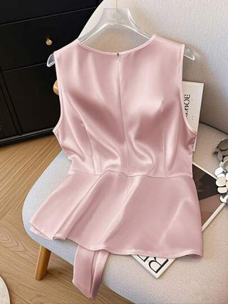 Clasi المرأة الأنيقة ذات الرقبة على شكل V بدون أكمام، مزينة بربطة الخصر وفيونكة، تصميم أنيق بلون واحد، توب أنيق للربيع والصيف