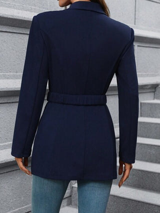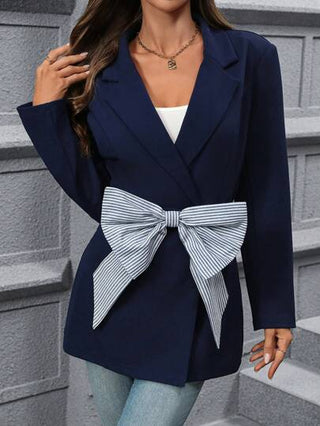 Clasi بدلة بليزر نسائية أنيقة ذات طوق بوبو مع شريط أزرق داكن ومتباين مع ربطة عنق في الخصر ضيقة الجسم مناسبة للشتاء