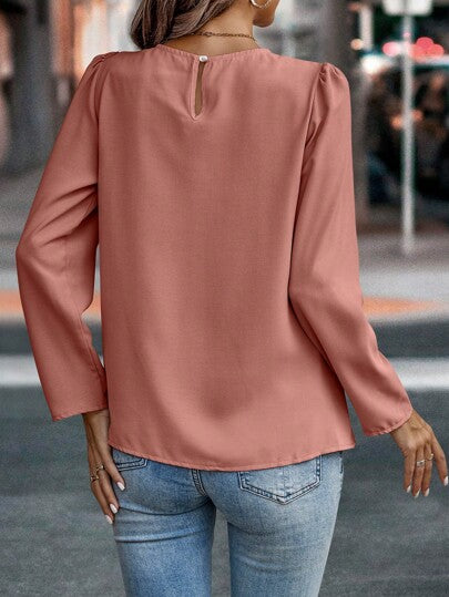 Clasi بلوزة كاجوال للنساء ذات لون سادة وياقة مستديرة وأكمام منتفخة ومطوية، خريفية