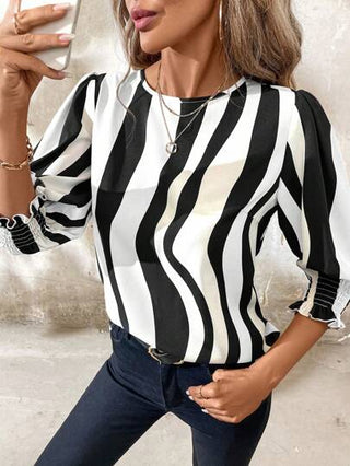Clasi بلوزة نسائية بأكمام ربع طول بأساور، بطباعة خطوط هندسية ، بلوزة سوداء وبيضاء
