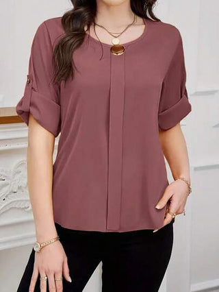 Clasi بلوزة نسائية بياقة دائرية وأكمام قصيرة وأزرار أمامية سادة، بسيطة وكاجوال للارتداء اليومي