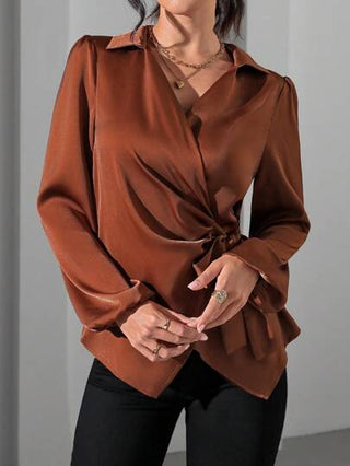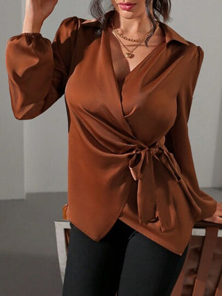 Clasi بلوزة نسائية كاجوال ذات أكمام منتفخة وربط جانبي من قماش معدني موضوع، سترة بأكمام طويلة