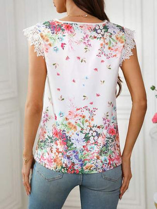 Clasi بلوزة نسائية مطبوعة بالأزهار مع تطريز دانتيل متباين الألوان ، ملابس علوية أكمام قصيرة