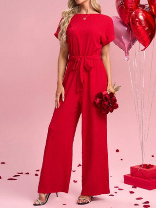 Clasi جمبسوت رومانسية حمراء اللون قصيرة الأكمام مزينة بربطة عند الخصر وباكمام قصيرة وعنق دائري وساق مستقيمة للنساء، ملابس صيفية وربيعية لإطلالات عطلات وعيد الحب