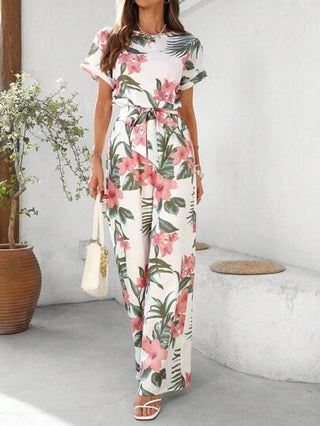 Clasi جمبسوت صيفية أنيقة للنساء مطبوعة بنباتات استوائية مع وسط قابل للتعديل، قصيرة الأكمام، مناسبة للاستخدام في مناسبات مختلفة