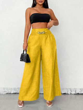 Clasi سراويل فضفاضة ذات خصر عالي مرتبة بسلاسل معدنية ، سراويل كتانية بلون الخردل للنساء في فصل الخريف