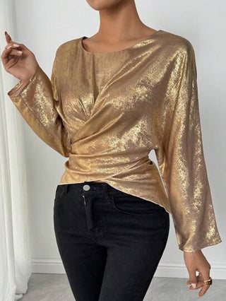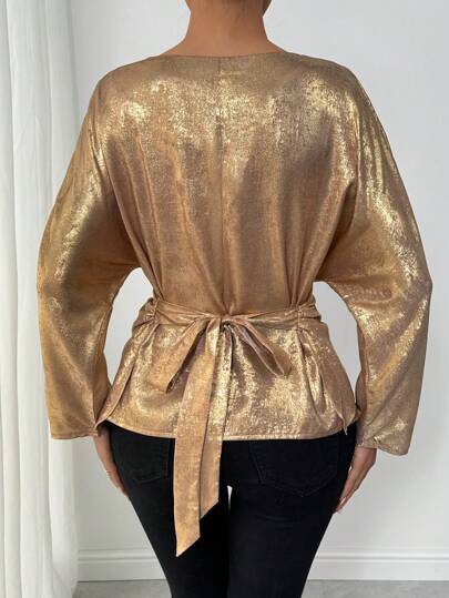Clasi قميص نسائي طويل الأكمام لامع معدني براثنة الخصر أمامي ملفوف بربطة