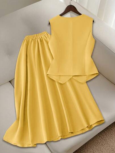 Clasi مجموعة من الفستان ماكسي بقصة A والسترة الأنيقة بدون أكمام وياقة V واشكال عقدة الخصر، باللون الأحادي بطراز رجعي للعطلات والمواصلات