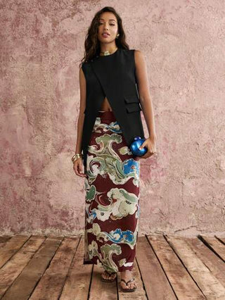COSMINA بليزر أنثوي بياقة واقفة وذيل غير متماثل بدون أكمام، ذو لون أحادي