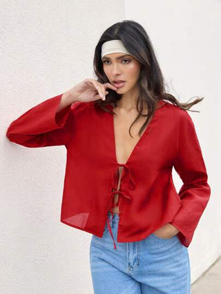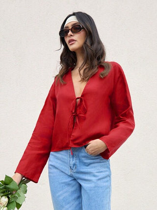 COSMINA ملابس علوية نساء طويل الأكمام من خليط الكتان باللون الأحمر الأساسي، بربطة عنق، أناقة الشارع بتصميم واسع وخفيف للربيع