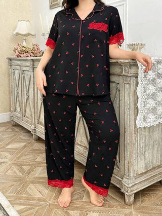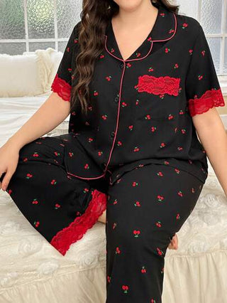 CottageSlumber طقم بيجاما مطبوع بالكرز مع رقع من الدانتيل والكشكشة، لحجم كبير الحجم