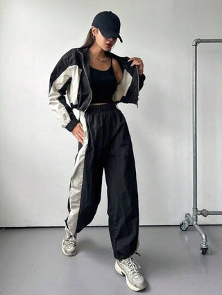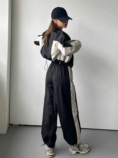 DAZY بدلة سحاب أمامي مع رباط طويلة الأكمام بتصميم لوني متباين للنساء، قطعتان