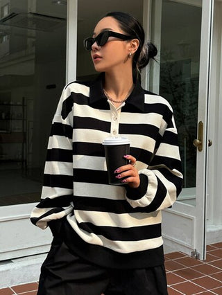 DAZY بلوزة رياضية ذات ياقة بولو مخطط وأكمام متدلية، بأكمام طويلة وزر بخصر طبيعي لسيدات أواخر الخريف، ملائمة للاستخدام اليومي، باللونين الأبيض والأسود