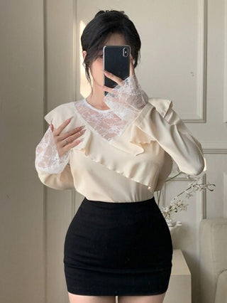 DAZY بلوزة كاجوال طويلة الأكمام مزخرفة بالكشكشة والقطع من الدانتيل