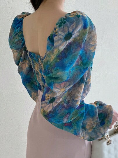 DAZY بلوزة نسائية ضيقة بياقة مربعة مطبوعة بنقشة زهور، بأكمام منتفخة، لون أخضر، مناسبة للربيع/الصيف/الخريف