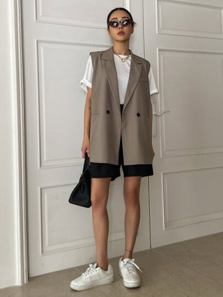 DAZY بليزر سيدات أعمال أكمام بلا قبة مزدوج الصدر موحد اللون غير رسمي