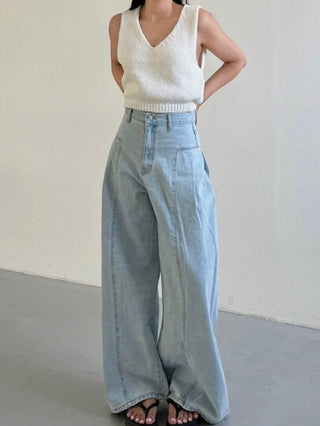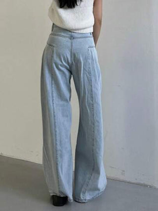 DAZY بنطال جينز طويل بساق عريضة مشقوقة بغسل فاتح، جميع المواسم