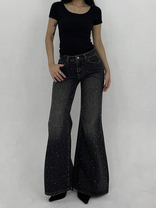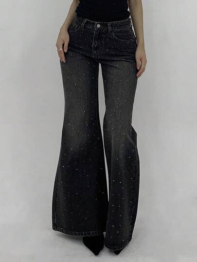 DAZY بنطلون جينز فضفاض مرصع بالراين للنساء، كاجوال بسيط للأناقة اليومية