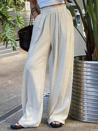 DAZY بنطلون كاجوال مستقيم الساق، بنقوش مخطط، مفصل بالخصر البارز، من الكتان، مناسب للعطلات النسائية