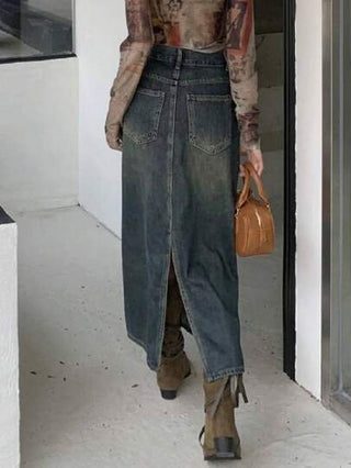 DAZY تنورة جينز متوسطة الطول مغسولة بطريقة عتيقة مع جيوب للنساء