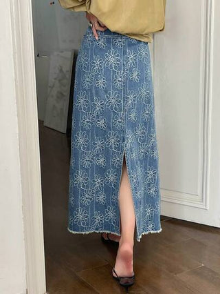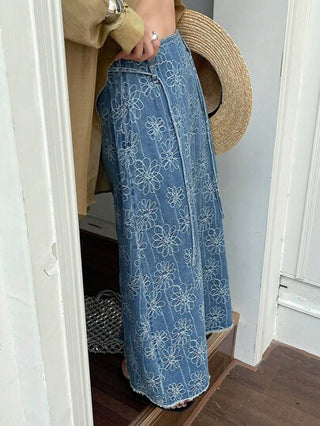 DAZY تنورة قماش ماكسي جينز طويلة عالية الخصر للنساء مزينة بكشكشة وأربطة صيفية