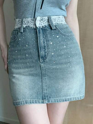 DAZY تنورة مينى جينز سكنى مرقعة بالدانتيل للنساء