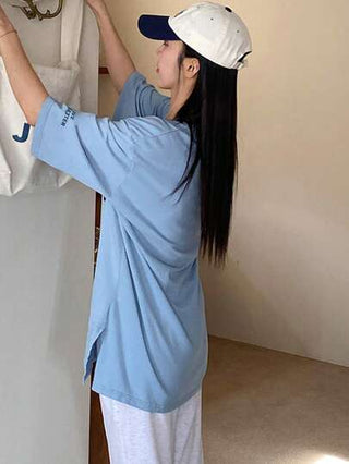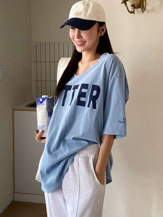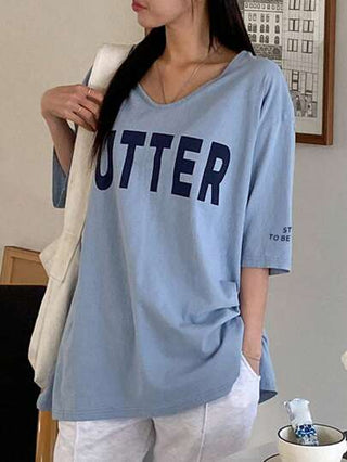 DAZY تيشيرت طويل رقبة V فضفاض وقصير الأكمام للنساء مع طباعة حرفية، تيشيرت صيفي كبير الحجم