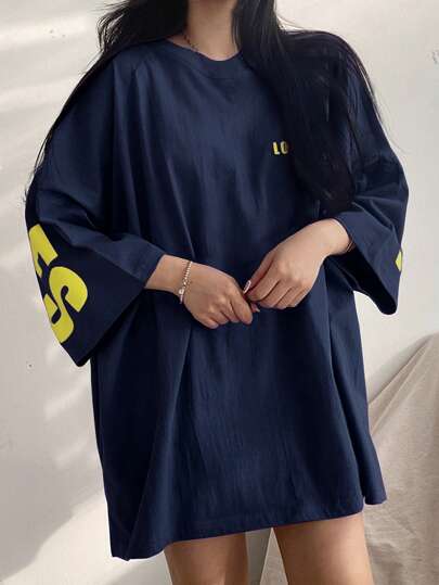 DAZY تي شيرت صيفي فضفاض للسيدات بأكمام قصيرة مع طباعة حروف وياقة مستديرة تصميم واسع