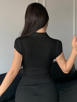 DAZY تي شيرت صيفي نسائي بقصّة ضيّقة وأكمام قصيرة وياقة قابلة للطي، لون سادة، لباس عرضي عصري