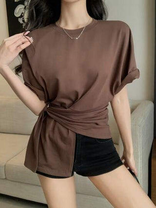 DAZY تي شيرت نسائي أساسي بياقة مستديرة, أكمام قصيرة, تصميم معقوف، إطلالة صيفية