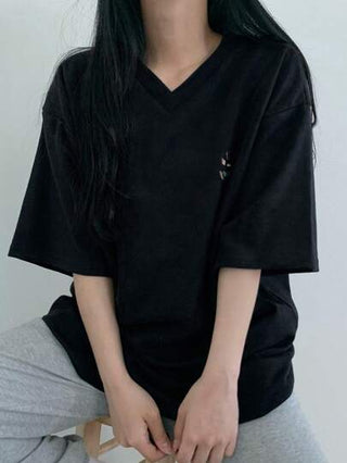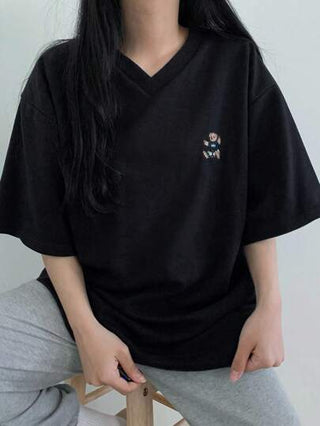 DAZY تي شيرت نسائي فضفاض صيفي بياقة V وطباعة دب وتصميم أكمام منسدلة