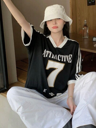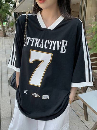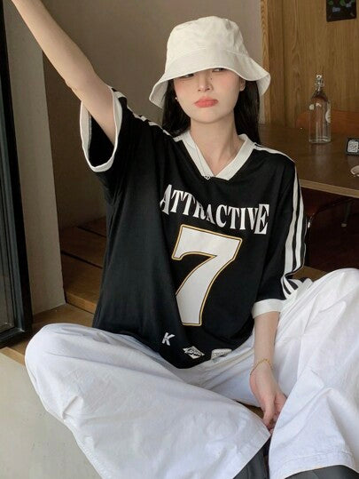 DAZY تي شيرت نسائي كاجوال، برقبة على شكل حرف V مع تصميم خطوط تباين ورسمة أرقام وحروف، أكمام قصيرة، تي شيرت كبير الحجم