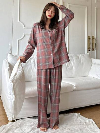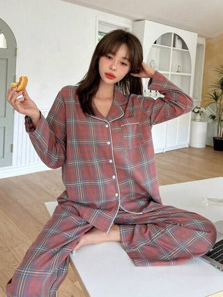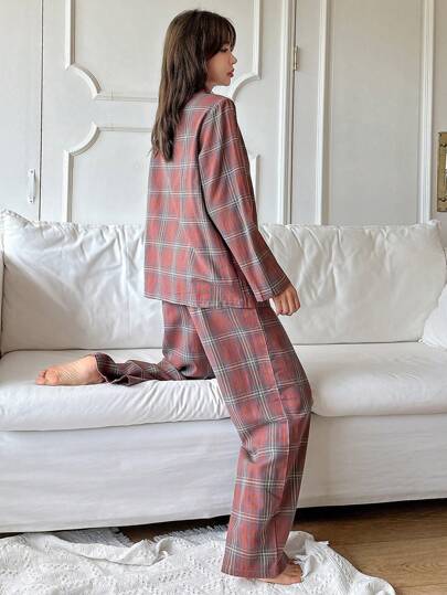 DAZY طقم بيجامات منقوش بسروال وبلوزة طويلة الأكمام بياقة منقوصة ذات زر واحد للنساء