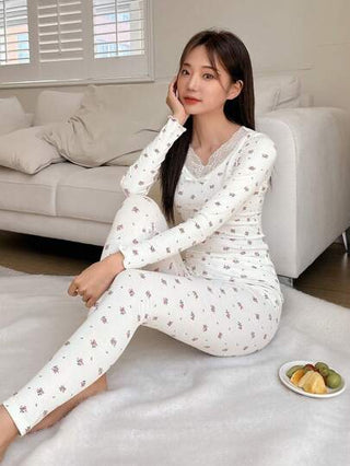DAZY طقم بيجاما أبيض ضيق بطبعة زهرية باتش عمل الدانتيل