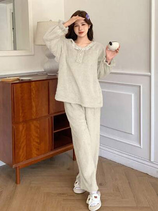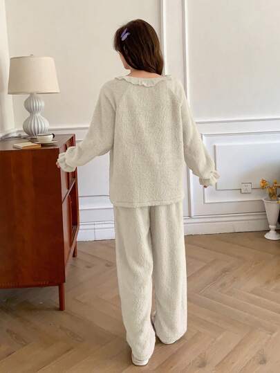 DAZY طقم بيجاما ذو طوق فضفاض سميك مزين بالكشكشة من الفلانيل الناعم