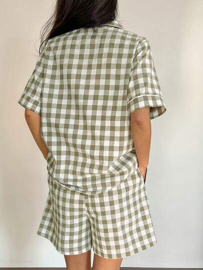 DAZY طقم بيجاما فضفاض بأكمام قصيرة وشورت بنمط مربعات بسيط