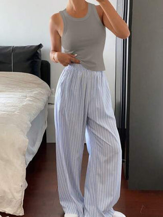 DAZY طقم بيجاما للنساء يتكون من ملابس علوية كأميه لون واحد وبنطال نوم فضفاض مخطط