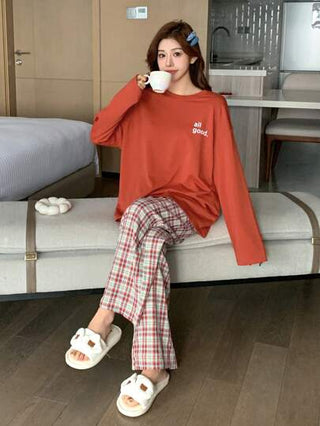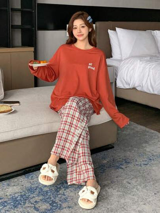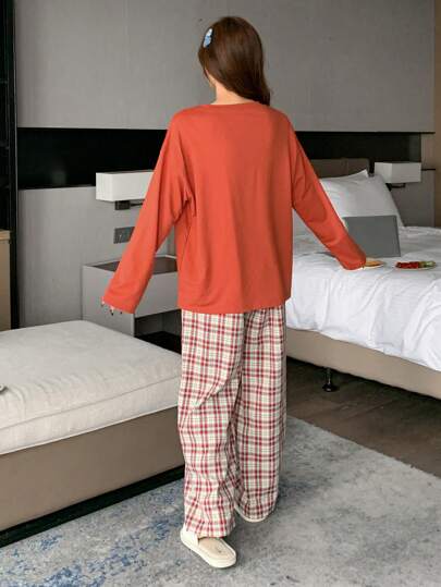 DAZY طقم بيجامة مكون من تي شيرت بأكمام طويلة بطبعات حرفية وسراويل بنمط مربعات ، طقم بيجامة مكون من قطعتين