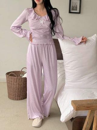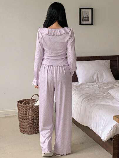 DAZY طقم ملابس علوية فضفاضة مخصرة وبنطال فضفاض ذو تصميم حواف متموجة مزخرف بالزهور، ملابس نوم