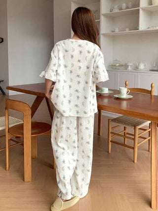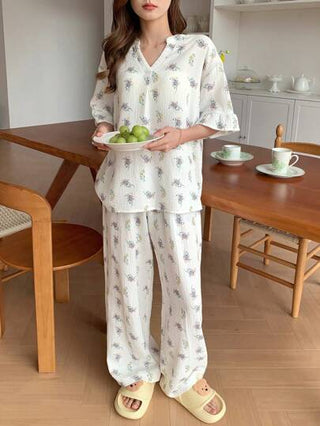 DAZY طقم ملابس نوم فضفاضة ذو طباعة زهرية وحافة مزركشة, طقم أبيض