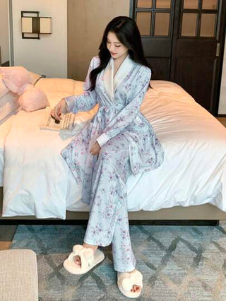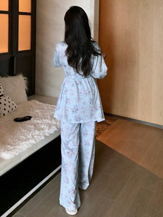 DAZY طقم ملابس نوم وخروج من البيجامة بسروال وبلوزة رقبة على شكل V من الساتان بتصميم بتشورك الأزهار