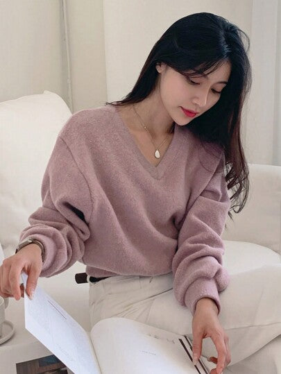 DAZY قميص ثقيل بأكمام طويلة وياقة V وفضفاض للنساء لون أحادي، مناسب للخريف والشتاء