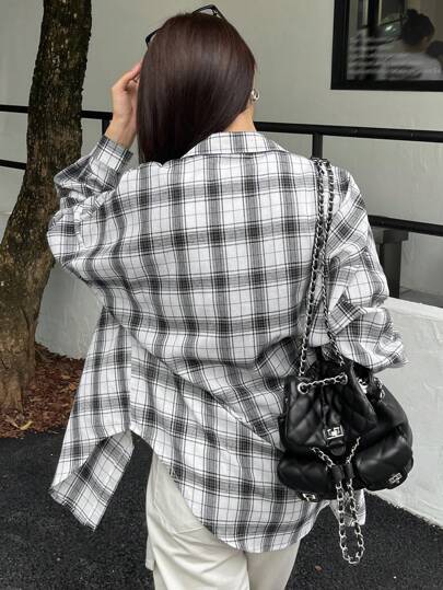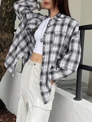 DAZY قميص كاجوال بأكمام طويلة مربعات كبير الحجم مع جيوب ، ربيع وصيف للنساء