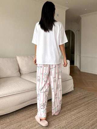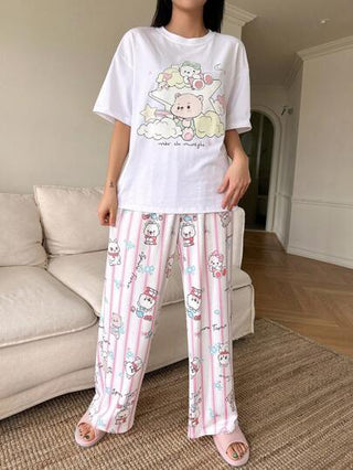 DAZY مجموعة بيجامات للنساء بفتلة جراب الدب الكرتونية الحلوة بأكمام قصيرة بيضاء وبنطلون مقلم طويل