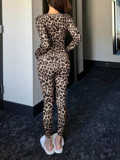 DAZY مجموعة بيجامة مثبتة بالشكل ذات رقبة على شكل حرف V مطبوع بنمط نمر مخملي مع لمسات شبكية