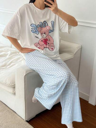 DAZY مجموعة بيجامة نسائية قصيرة الأكمام فضفاضة ذات طبعة الدب ، بنطال طويل مربع ، صيفي ، قطعتين/طقم