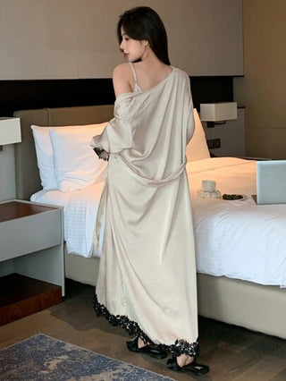 DAZY مجموعة فستان نسائي كامي من الساتان للنوم، قميص نسائي من الساتان ذو فتحة العنق العميقة الخارجي وفستان قصير من الدانتيل المتباين