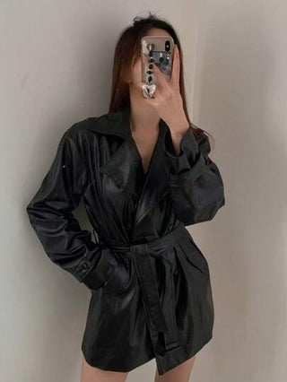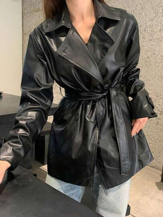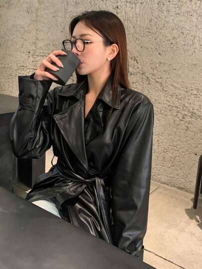 DAZY معطف نسائي موضة فضفاض من جلد البولي يوريثان بياقة قصيرة وأكمام طويلة، خريف