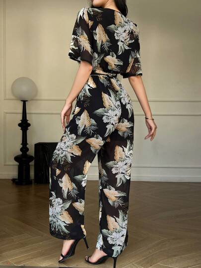 DAZY ملابس نسائية قطعة واحدة مزينة بطبعات زهور برقبة V ومزينة بجيوب كشكشة مربوطة