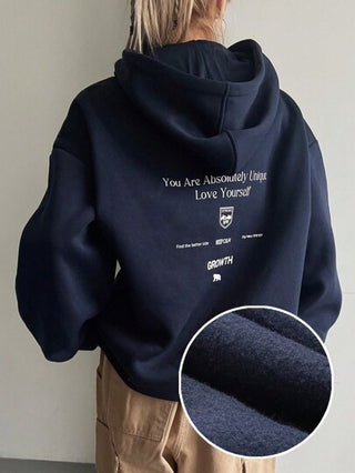 DAZY هودي مبطن حراري بخصر مشدود بشعار جرافيك على الكتف، "أنت متفرد تمامًا، احب نفسك بقوة، اكتشف جانبك الأفضل، حافظ على هدوئك، نمو، جرب أشياء جديدة"، أكمام طويلة، ملابس رمضان